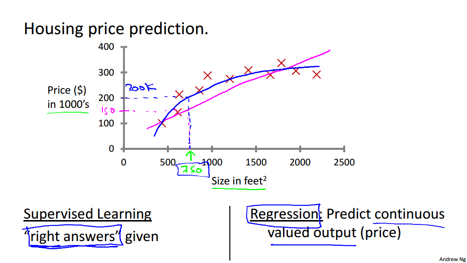房价预测训练集中,同时给出了输入 和输出结果 ,即给出了人为标注的”正确结果“,且预测的量是连续的,属于监督学习中的回归问题。