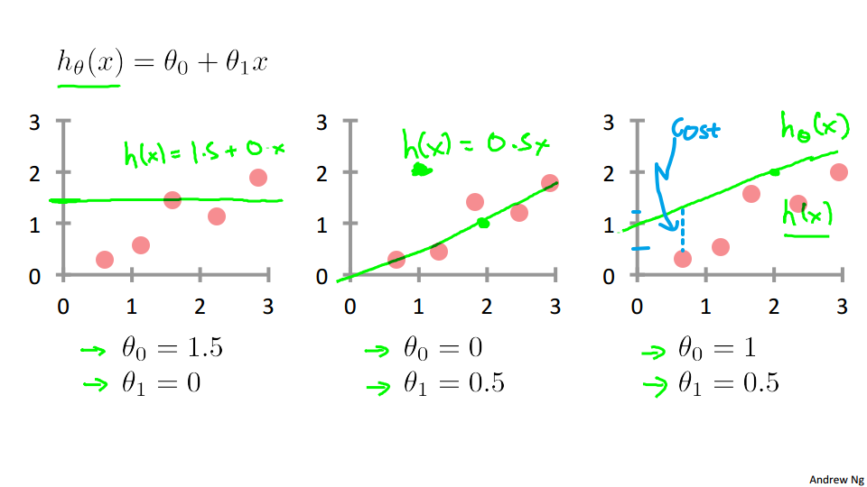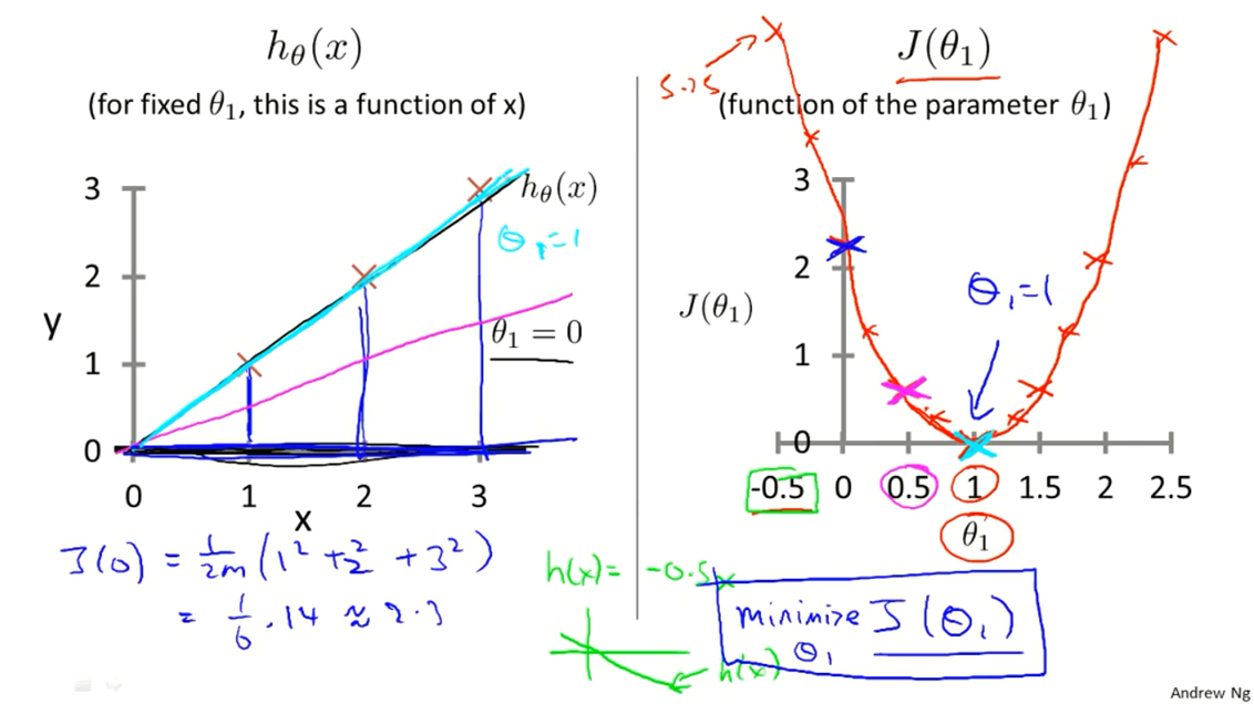 为了直观理解代价函数到底是在做什么,先假设 ,并假设训练集有三个数据,分别为,这样在平面坐标系中绘制出 ,并分析 的变化。