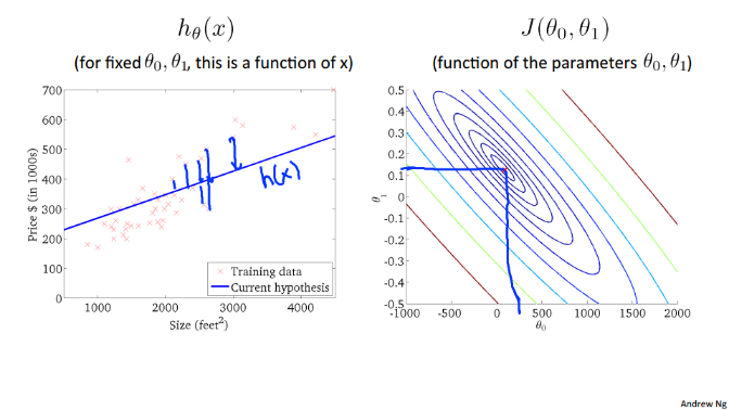 梯度下降背后的思想是:开始时,我们随机选择一个参数组合即起始点,计算代价函数,然后寻找下一个能使得代价函数下降最多的参数组合。不断迭代,直到找到一个局部最小值(local minimum),由于下降的情况只考虑当前参数组合周围的情况,所以无法确定当前的局部最小值是否就是全局最小值(global minimum),不同的初始参数组合,可能会产生不同的局部最小值。