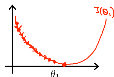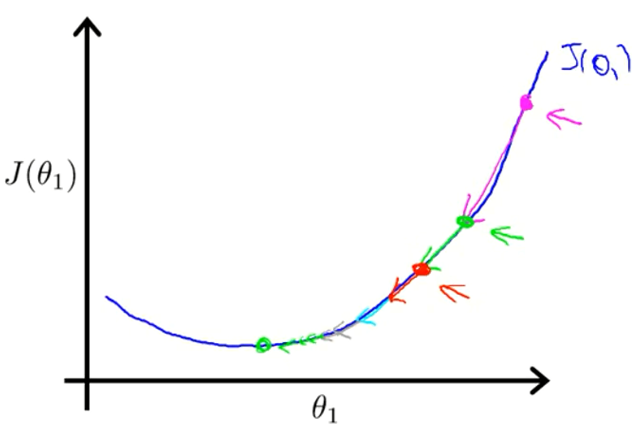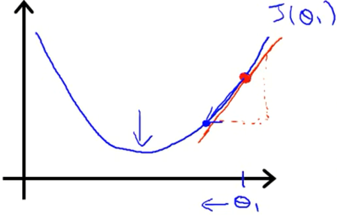把红点定为初始点,切于初始点的红色直线的斜率,表示了函数 在初始点处有正斜率,也就是说它有正导数,则根据梯度下降公式 , 右边的结果是一个正值,即 会向左边移动。这样不断重复,直到收敛(达到局部最小值,即斜率为0)。