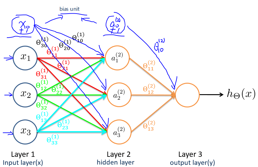 图中的一个圈表示神经网络中的一个激活单元,输入层对应输入单元,隐藏层对应中间单元,输出层则对应输出单元。中间激活单元应用激活函数(activation_function)处理数据。