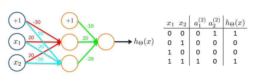 如上图,我们分别构建了三个单层神经网络,将这三个网络组合起来,可得到一个新的神经网络,其可完成逻辑运算中的异或(XNOR)操作:
