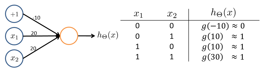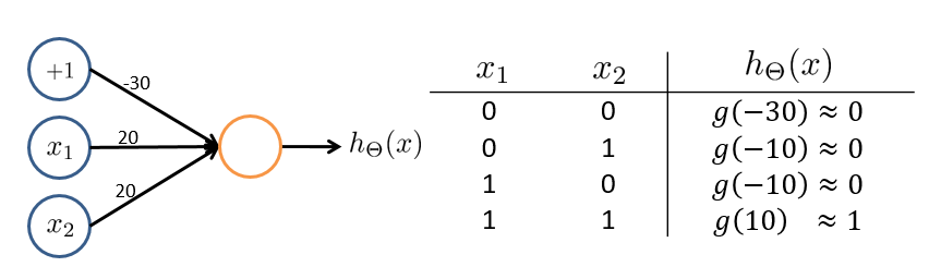 回顾 sigmoid 函数图像,根据输入则有上图中右边的表格,即 。这样就实现了一个能够进行与运算的神经网络。
