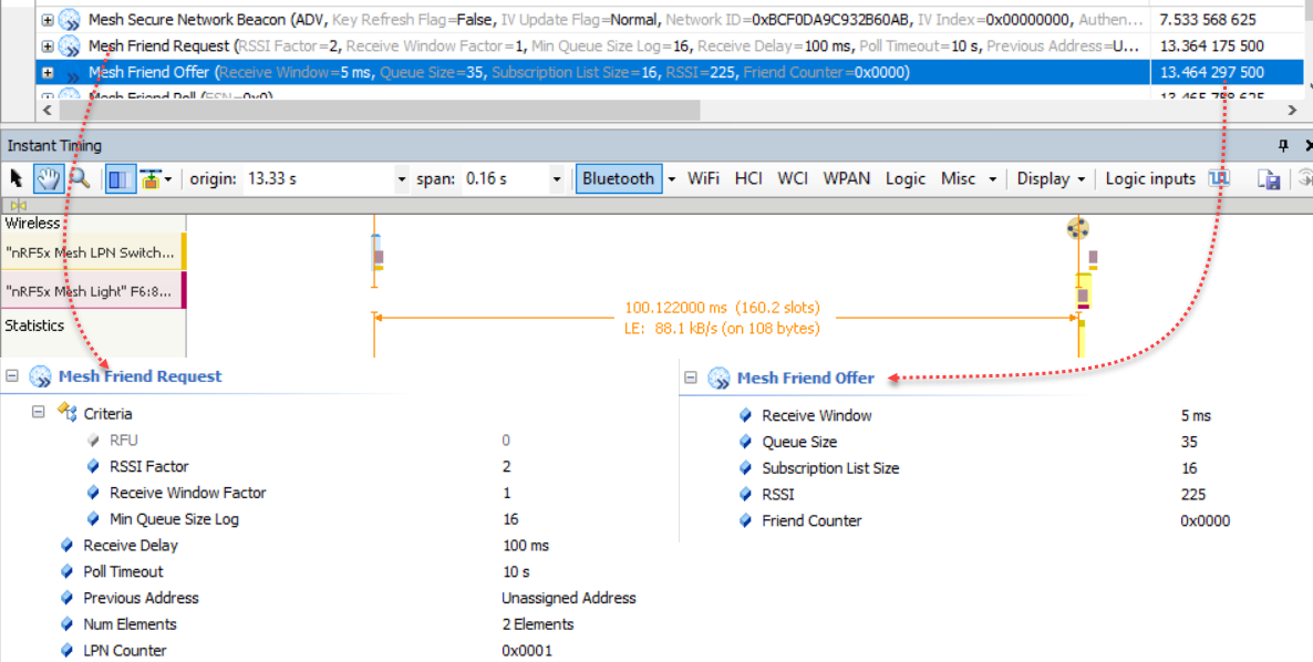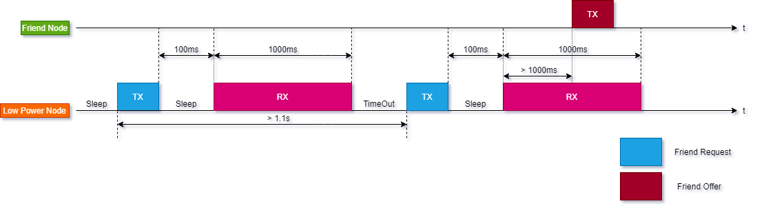 LPN发送完该消息之后等待100ms,紧接着监听来自于Friend Node的Friend Offer消息,最长时长为1秒;如果上述的1秒超时之后,LPN仍然没有收到Friend Offer的消息,那么协议栈一般就会向应用层上报Timeout事件;LPN此时可以选择重发Friend Request消息 (Spec没有强制要求,由用户自己决定,Nordic定义该值默认为5) ,只不过这两个连续的Friend Request消息的时间间隔要大于1.1秒(100ms+1秒)