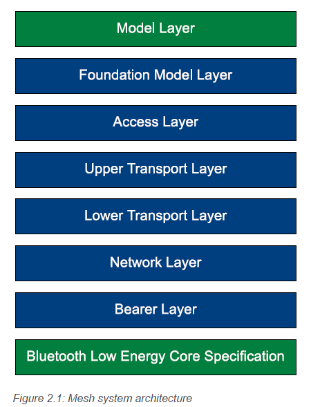 由上图可知,SIG MESH由模型层、基础模型层、访问层、上层传输层、下层传输层、网络层、承载层组成;这个时候可能读者会问,为什么低功耗蓝牙核心规范不被包含在内呢?