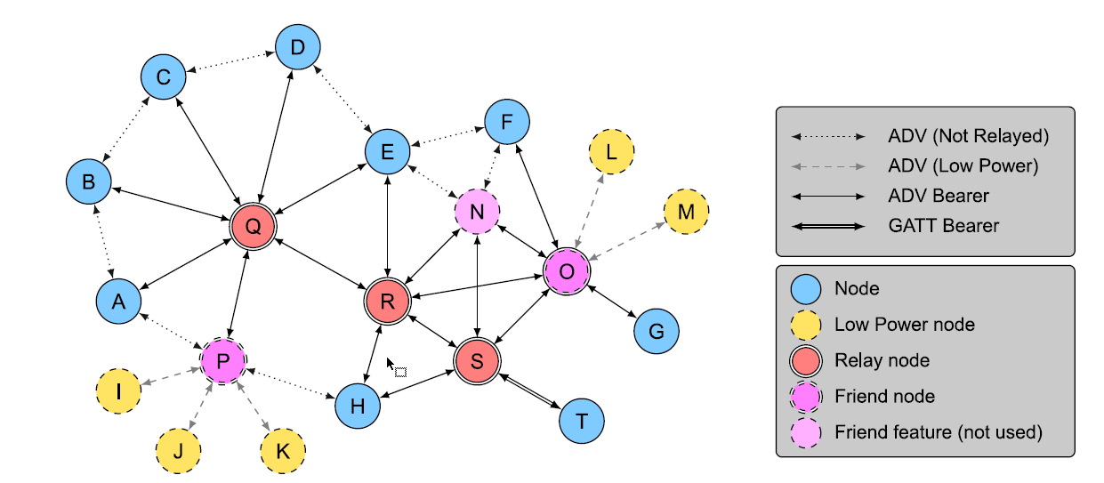 首先,具备中继特性的节点还不能被称为中继节点,官方的Mesh Spec对中继节点的定义是“具备中继特性且中继特性被使能的节点”,其作用是中继/转发节点通过广告承载接收的网络PDU。如果支持代理功能,则应支持GATT和广告承载。。