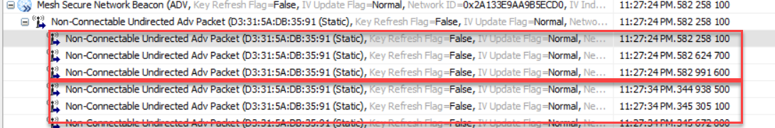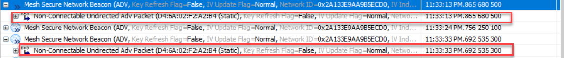 由上图可知,Beacon Interval = 20*1/2 = 10 秒;接着小编再举一个捉包图(SIG Mesh网络中仅有两个节点):