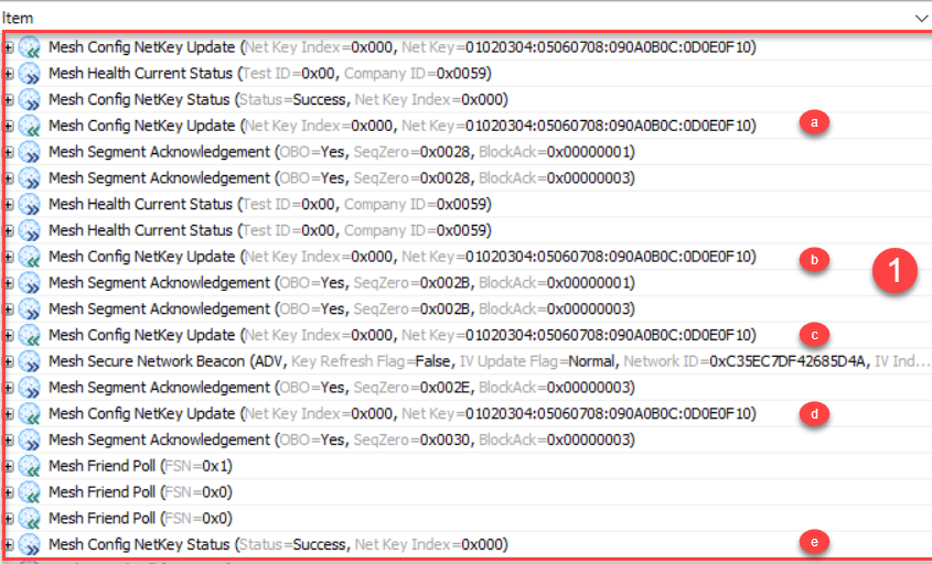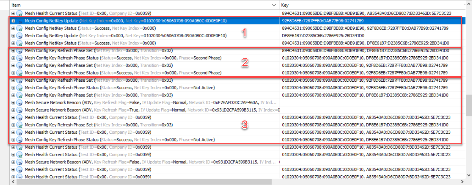 从上图我们可以知道,Configuration Model Client与白名单中的不同的节点发送Config命令时,则需要不同的DevKey;如果是使用这种组合的话,最好就不要与Secure Network Beacon混用,否则会增加Configuration Model Client处理的复杂度,导致是否要发送Config Key Refresh Phase Set命令之前,均要对每个节点进行判断当前处于阶段几。下图是一幅该组合的实际捉包图 (新的NetKey为0x0102030405060708090A0B0C0D0E0F10)