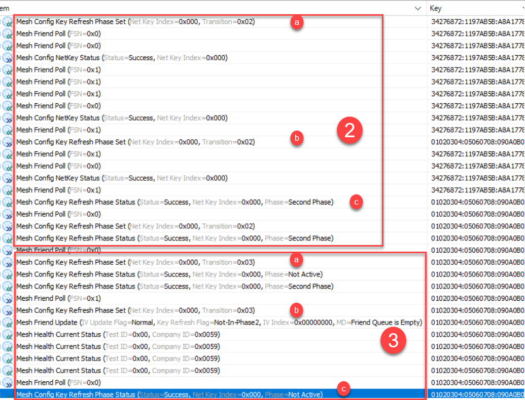 这里我们可以看到有4条Config NetKey Status消息,这也间隔地说明朋友节点帮LPN缓存了4条Config NetKey Update消息,因此LPN向Friend节点Poll的时候,给LPN回了4条Config NetKey Update消息;同理,Config Client给LPN发送Config Key Refresh Phase Set消息时,Config Client同样也是发送了几次之后,LPN才应答该消息 (如图中的2的C所示)