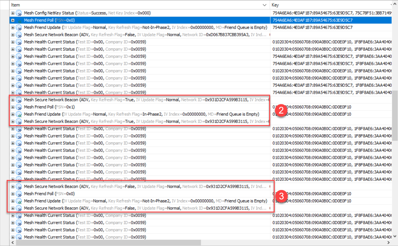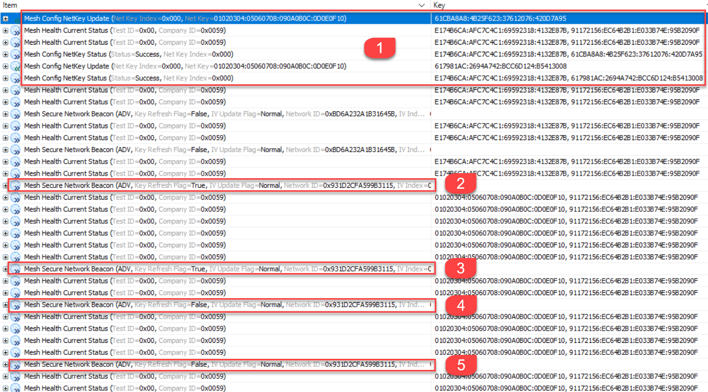 由上图可知,Config NetKey Update的流程跟上述的NetKey Update + Config Key Refresh Phase Set(LPN+FN)基本上是一致的;这里比较爽的就是发完Secure Network Beacon之后就完事了,然后接下来根据接收到的Secure Network Beacon的内容进行相对应的阶段切换;接下来大家可以看看该组合的实际捉包图: