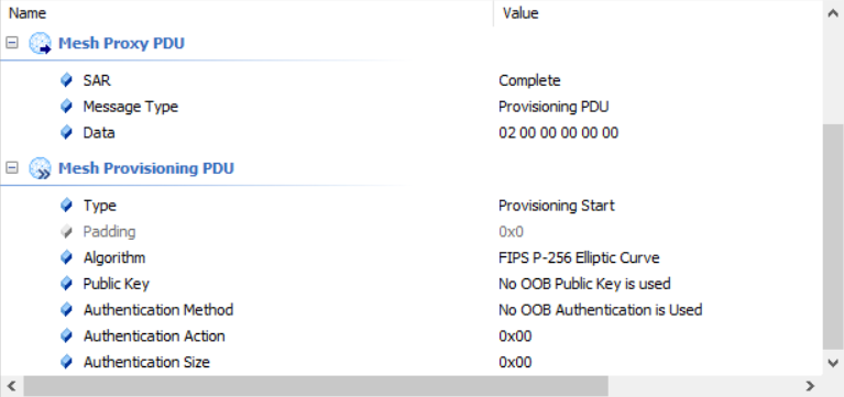 由上述的入网过程示意图可知,该PDU由Provisioner向provisionee发送,其主要作用就是根据provisionee回复的capabilities内容,决定接下来的公钥交换和认证采用哪种方式,具体携带参数如下所示:
