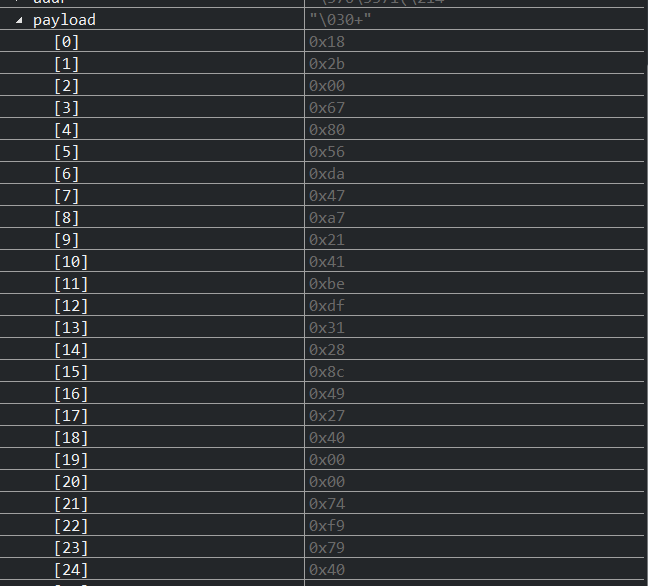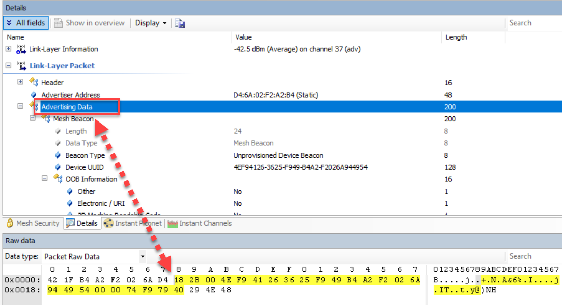 讲到这里,如果下次我们要修改unprovisioned beacon的间隔就可以通过修改宏NRF_MESH_PROV_BEARER_ADV_UNPROV_BEACON_INTERVAL_MS实现;至于,unprovisioned beacon的payload我们能修改的也只有URI以及OOB information两项内容了。基本上 send_unprov_beacon() 函数只是拼装并发出beacon信息,我们可以通过下图验证拼装的beacon数据包: