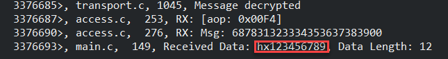 从上图我们可以看到,订阅了0xC000的节点接收到了 “hx123456789” 的自定义数据,这也就是说HX_MODEL_CLIENT_OPCODE_TX_UNRELIABLE命令被成功发送出去并被订阅0xC000的节点所接收