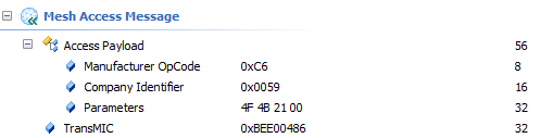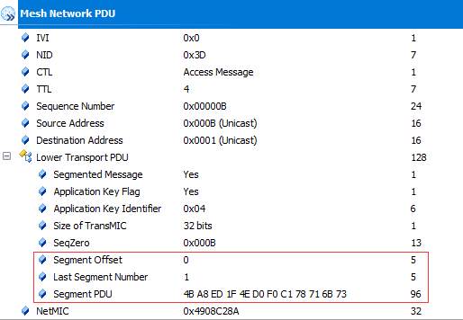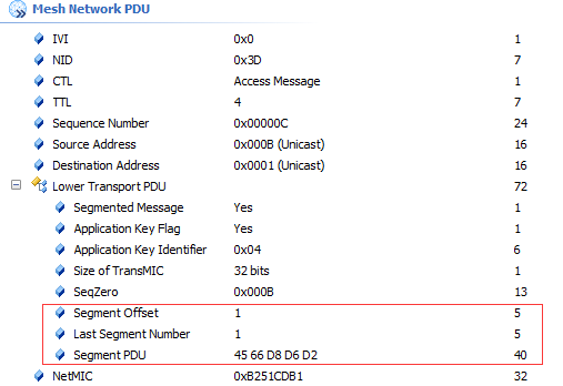 从上面的捉包图我们可以看到,小编发了Parameters 12 34 56 78 90 12 34 56 78 90共10个字节的消息,加上操作码和TransMIC共17个字节;小编很早之前在BLE Mesh各层帧包格式详解中就提及到最大不分包的Access PDU为15字节,故上述的17字节就一定要分包,同时我们也知道分包时满载荷最大为12字节;因此,17字节会为12+5两包来发送;那事实是否也是这样呢?请看下图: