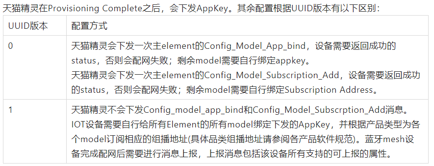当UUID版本为0时,天猫精灵只会向首元素发送Mesh Config Model Appkey Bind以及Mesh Config Model Subscription Add消息,其余的则需要用户自己行绑定及地址订阅