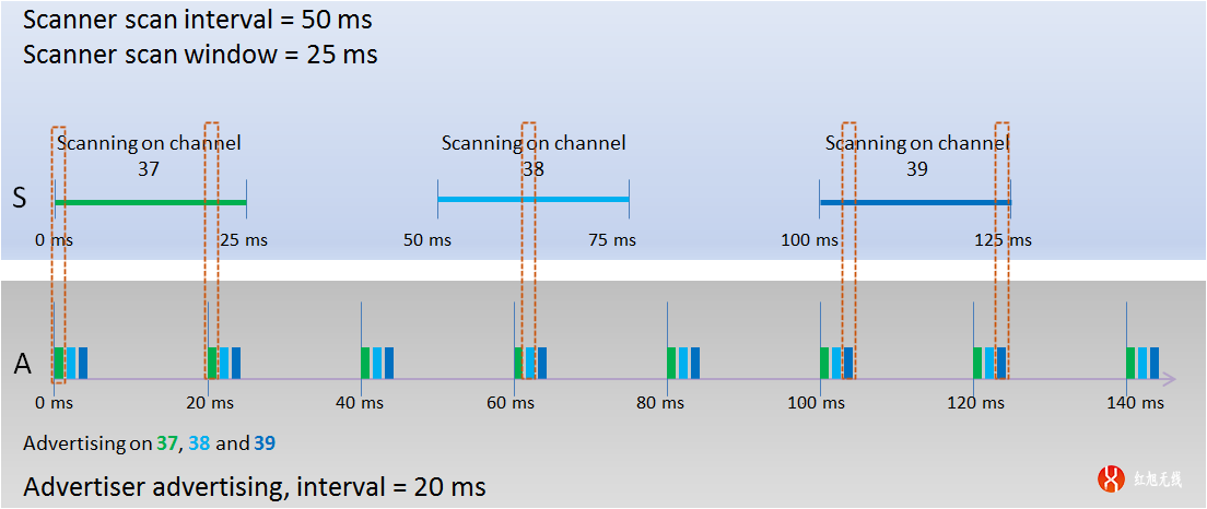 其中,37、38、39三个广播通道各广播一次数据则称为一个广播事件,而上一个广播事件与下一个广播事件的时间间隔则称为广播间隔;因此,我对广播时长这个概念相当的陌生,甚至怀疑这是天猫精灵对接协议规范的笔误😄(待考证);但是,就算有疑惑也不影响入网,小编就直接使用100ms的广播间隔,因为连接规范还提到了这句话:具体产品的广播启动方式和广播持续时间以产品需求为准;