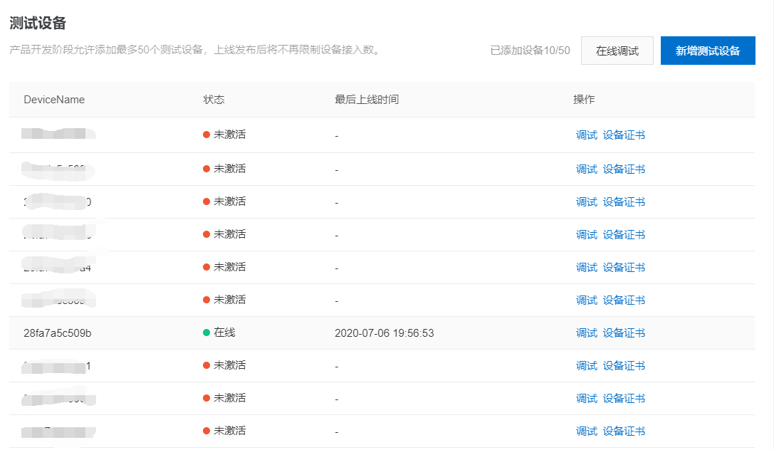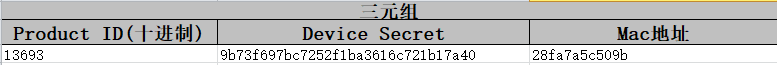 阿里巴巴平台会提供10组三元组用于调试时使用,如果后续产品要量产的话,则需要向阿里巴巴平台购买三元组,下图就是小编申请到的其中一组三元组信息: