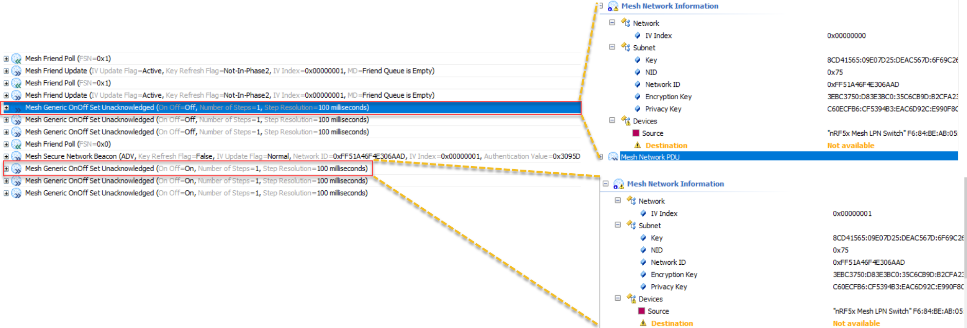 同样的,从上面的图中可知:F6:84:BE:AB:05:BE节点是处于Update状态且其当前的IV Index是4,当它接收到D4:6A:02:F2:A2:B4节点携带IV Index等于4的SNB消息时,F6:84:BE:AB:05:BE节点立马发起IV Index Update Procedure,IV Index值摇身一变就也变成4了并处于IV Index Normal状态,而且我们还可以看到此时F6:84:BE:AB:05:BE节点发的第一包Network PDU的Sequence Number为0,这个与我们在上面的场景4所描述的是完全吻合的;