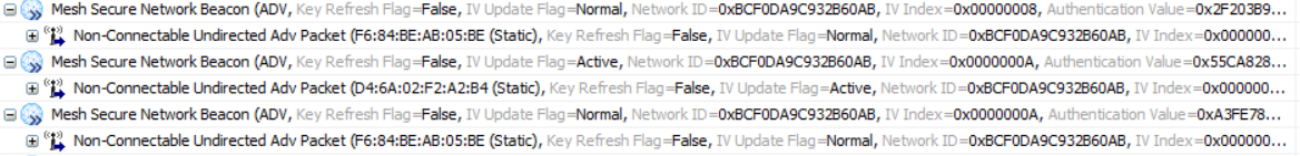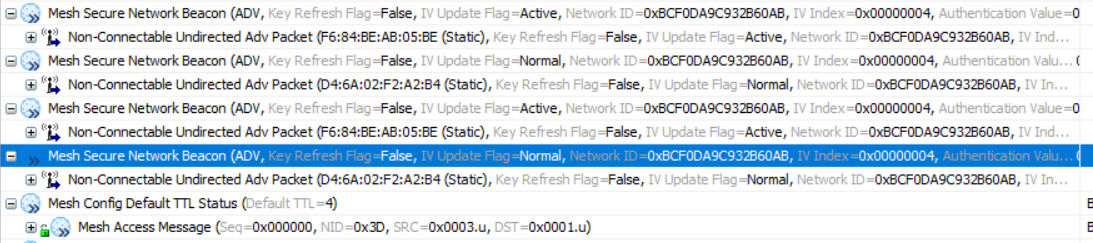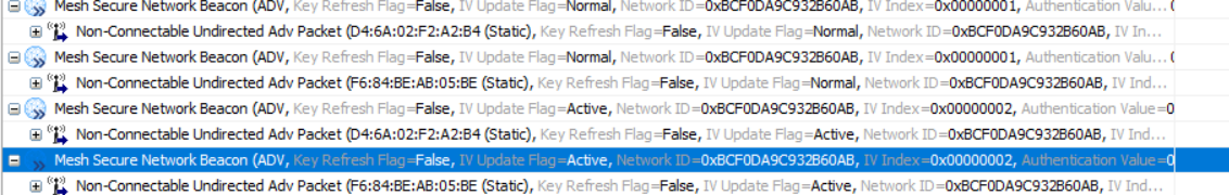 从上图我们可以看到,F6:84:BE:AB:05:BE节点是处于Normal状态且其当前的IV Index是1,当它接收到D4:6A:02:F2:A2:B4节点 携带IV Index等于2的SNB消息时,F6:84:BE:AB:05:BE节点立马发起IV Index Update Procedure,IV Index值摇身一变就也变成2了并处于IV Index更新状态,这个与我们在上面的场景3所说的是完全吻合的;