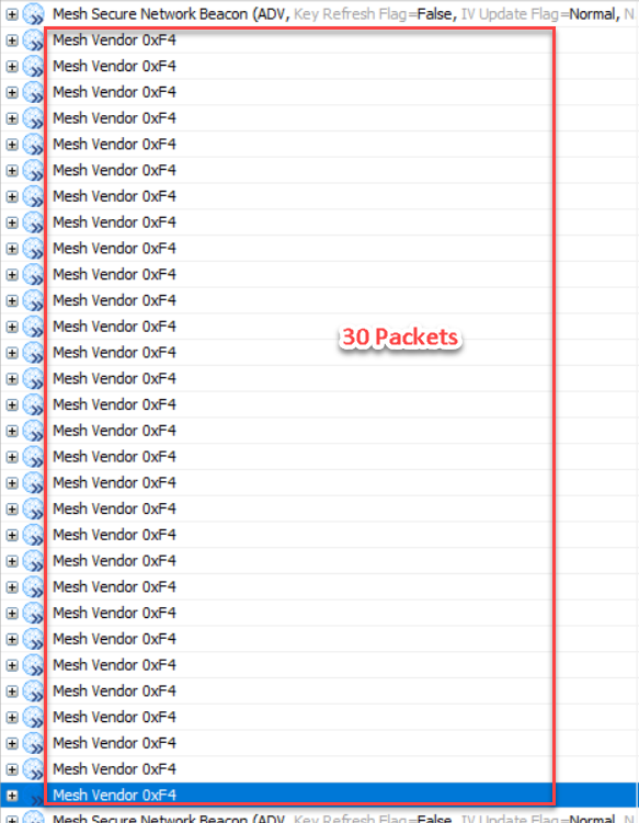 相对于上述的单播地址而言,如果目标地址为虚拟地址或者组地址时,对端设备则不需要发送应答消息;由于SIG Mesh采用的是发布与订阅的对话机制,这也就是说如果目标地址是组地址或者虚拟地址也要应答消息的话,那么整个Mesh网络就会充斥着大量的广播包,从而导致整个网络鲁棒性骤降。针对这种情况,SIG MESH Specification建议多发几次分包,这也就是为什么小编使用红旭Vendor模块发送目标地址为组地址的分包时,发送了4次 (完整的Access PDU发送了4次);