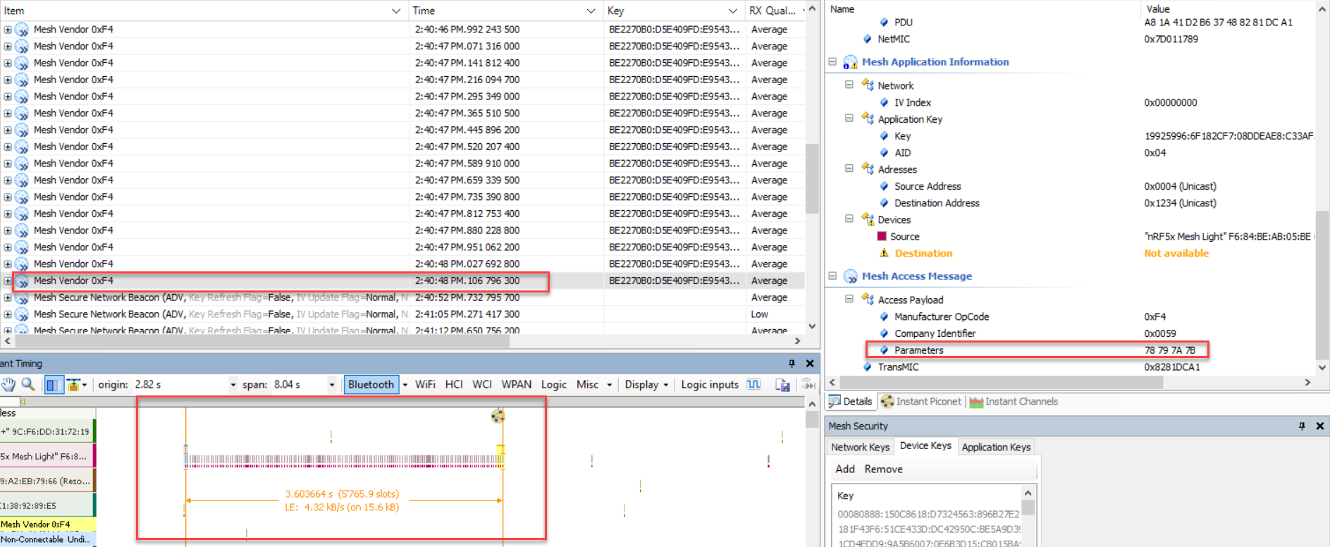 由上图我们可知,不分包且能给应用层用的就是15字节,然后再减去TransMIC,最大能用的就是11个字节,再如果使用的是Vendor模型,那么此时最大能用的就是8个字节了;换句话说:“可以给应用层任意修改的不分包最大载荷量为8个字节(仅限Vendor模型)”,有了这个理论知识之后,我们再看一看应用拆包又是怎么样的?