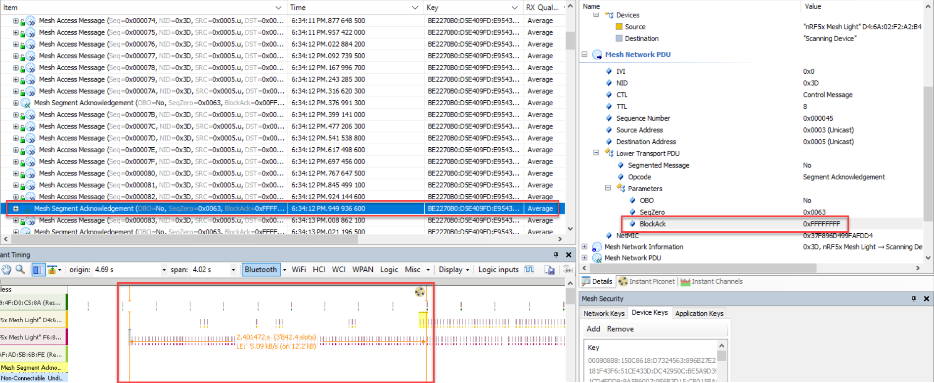 由上图我们可以很清楚地看出,应用层分包的每一包都携带有Opcode和TransMIC,正因为这样导致应用层拆包时,有效的载荷包没有自动分包多;既然如此,但是应用层分包是不需要应答的 (这里的应答仅仅指的是分包响应,如果采用可靠传输发送这些应用层分包的话,那么每包都会应答;虽然这样做没有问题,但是效率不高,远不如自动分包的机制,所以我们这里不讨论这个),那么这是不是意味着 “自动分包就一定比应用层拆包快呢?”,在回答这个问题之前,我们不妨先做如下两个实验: